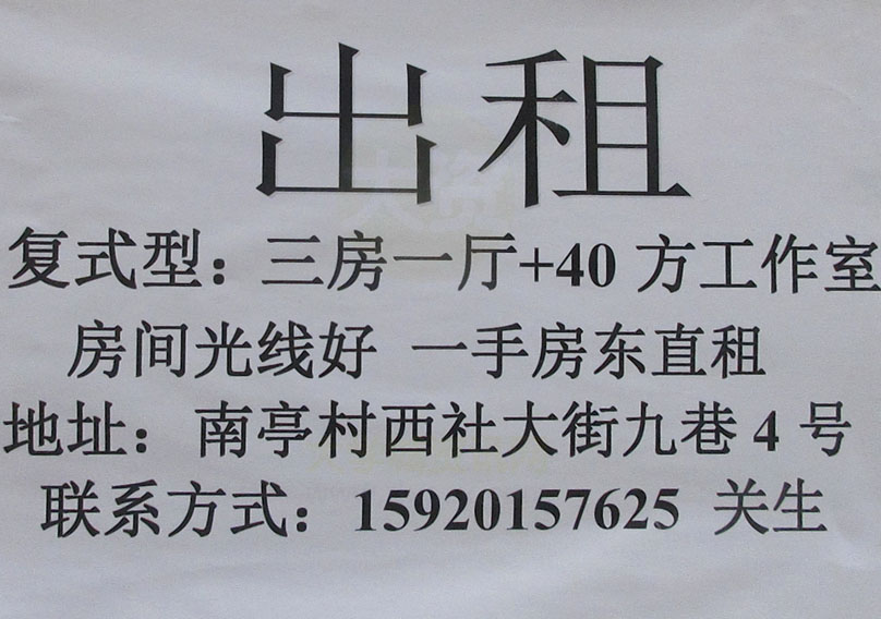 南亭村西社大街九巷4号 三房一厅复式户型+40方工作室出租 光线好 一手房东直租 联系15920157625关生 |