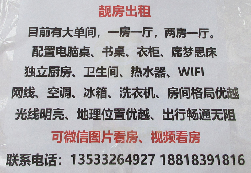 | 靓房出租 大单间、一房一厅、两房一厅 配电脑桌、书桌、衣柜、独立卫厨热水器等 | ||||||