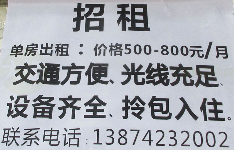 | 单房招租 价格500-800元每月 交通方便、光线充足、设备齐全、拎包入住 联系电话13874232002 | ||||||