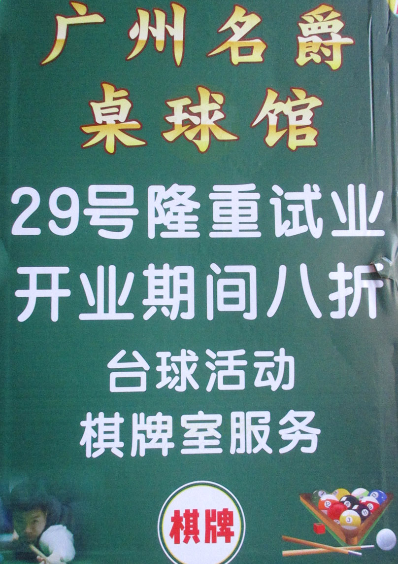 南亭大道中 名爵桌球馆 29号隆重试业 开业期间八折 除了台球外,还有棋牌室