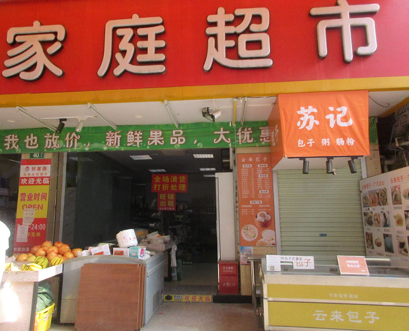 南亭大道南-好家庭超市好像在说全场清货打折处理,并且铺面似已隔出一半写旺铺招租,另外其隔边上的早餐包子铺也说内部装修歇业几天