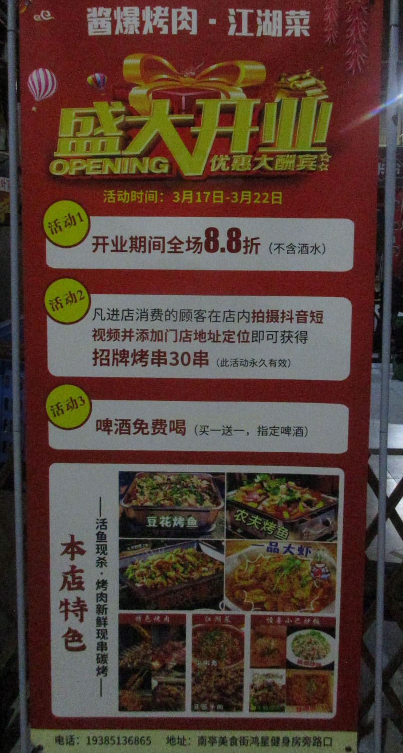 南亭商业街4号楼西北端坡道口 内进不到10米 近日新开一家叫黔味酱爆烤肉江湖菜 开业期间一周内有优惠福利活动