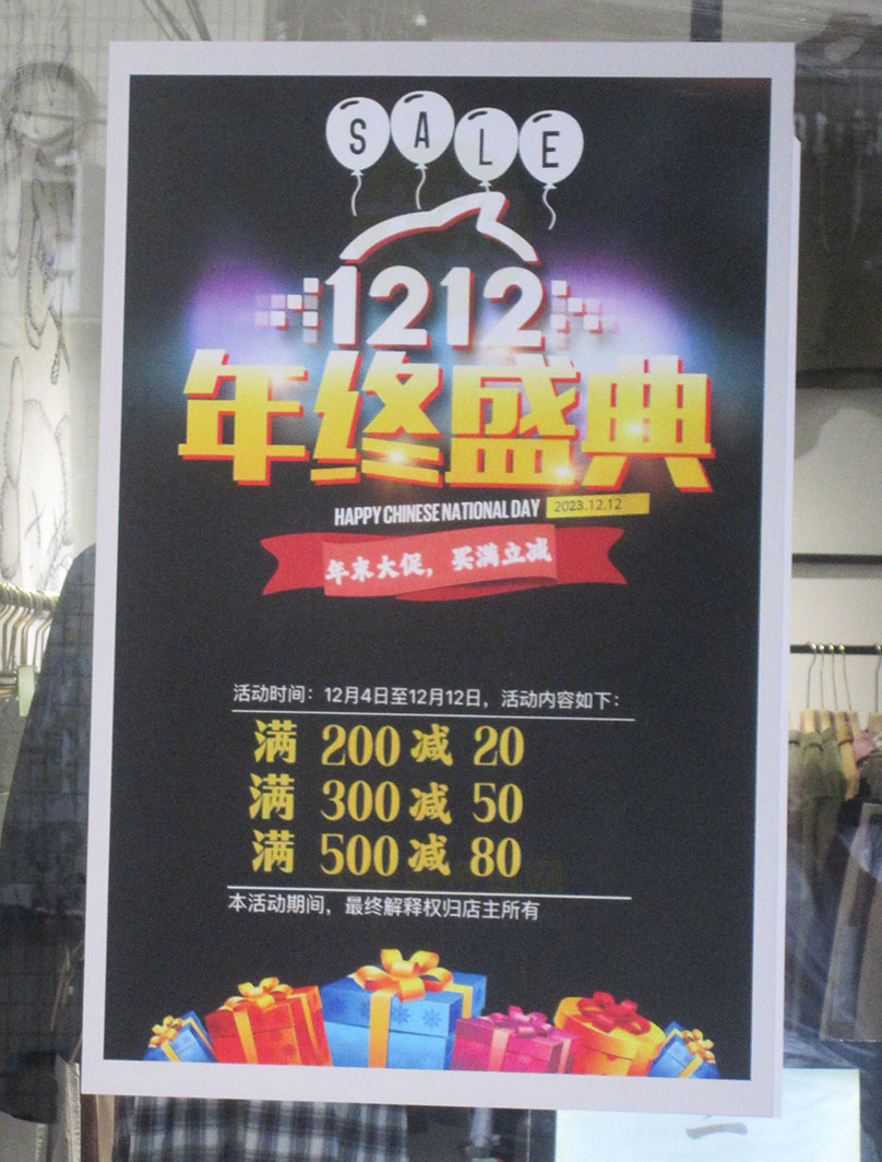 | 南亭-西社大街中 A.T服装店 双12满减活动 12.4-12.12 满200减20 满300减50 满500减80 | ||||||