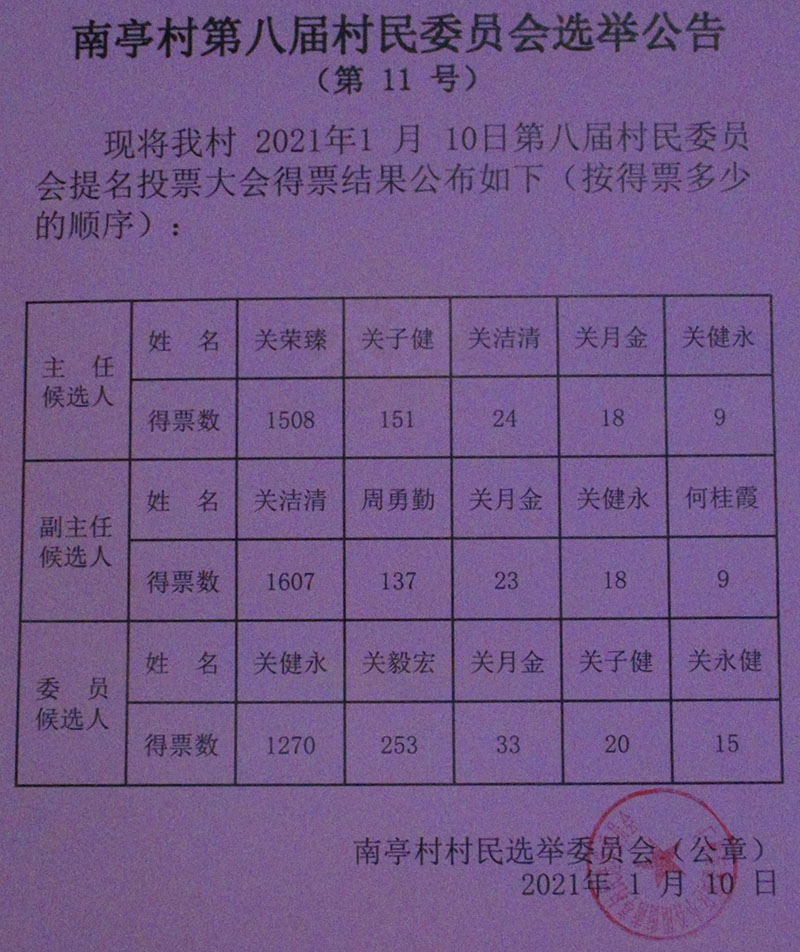 | 南亭村第八届村民委员会选举结果公布2021.01.10 | ||||||