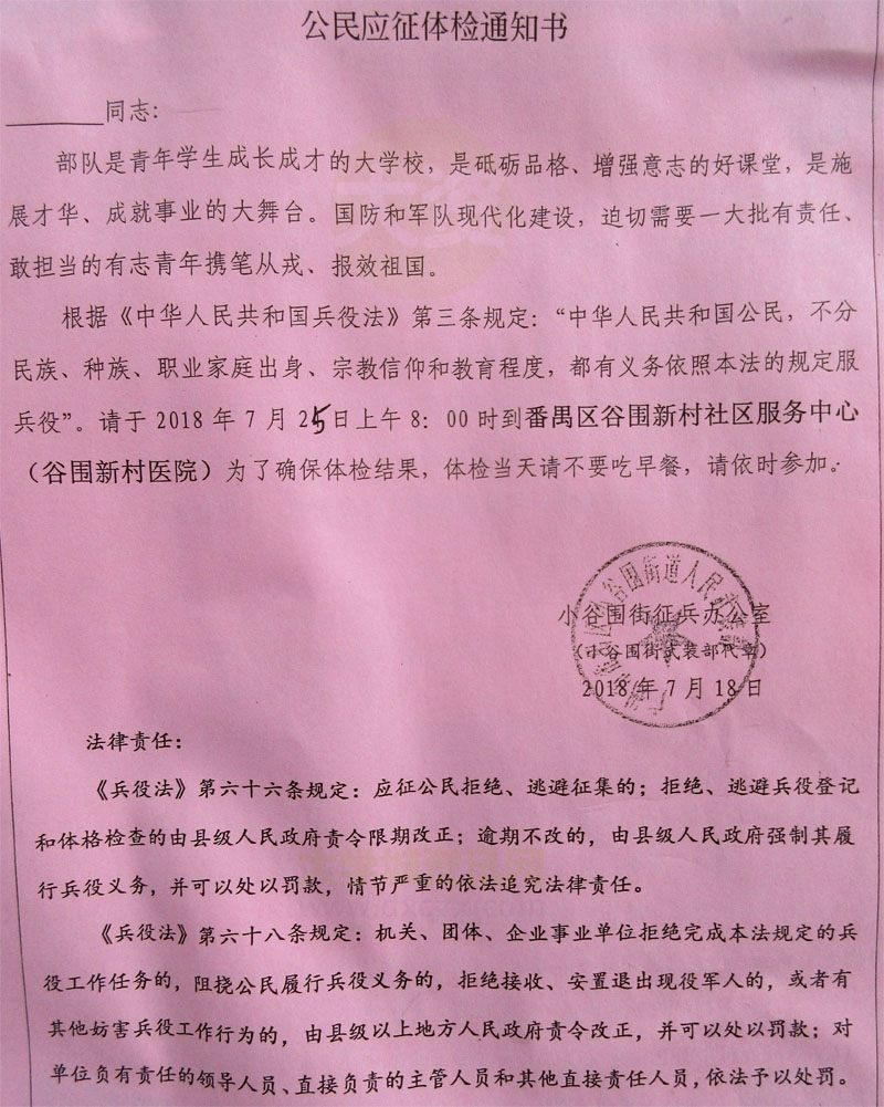 | 番禺区小谷围街 公民应征服兵役体检通知书 | ||||||