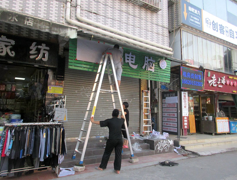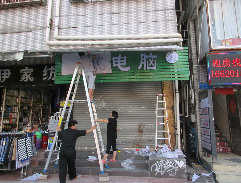 南亭大道中 一空铺在装修门面招牌,是学承电脑,做电脑笔记本维修配件方面的,是原先西社大街南的那里要搬过这边来了吗,搬到这里应该是更佳更合适了吧,毕竟是南亭村主干大道,又是中间位置,人流量可见度都不会比西社大街南差