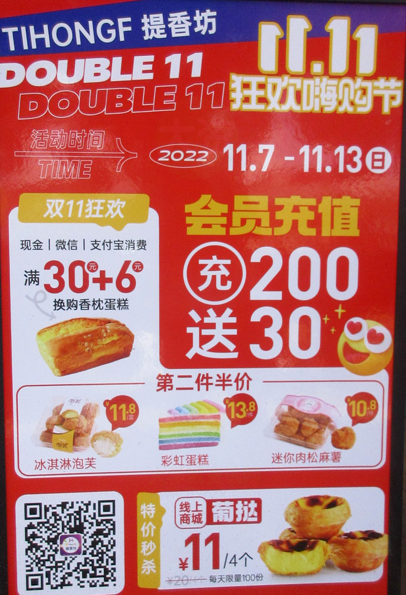 南亭大道中 提香坊蛋糕面包店 双11狂欢嗨购节 11.07-11.13 购满30元再+6元可换购香枕蛋糕 会员充200送30 冰淇淋泡芙,采虹蛋糕,迷你肉松麻薯第二件半价 线上商城葡挞特价11元4个(原价20元4个,每天限量100份)