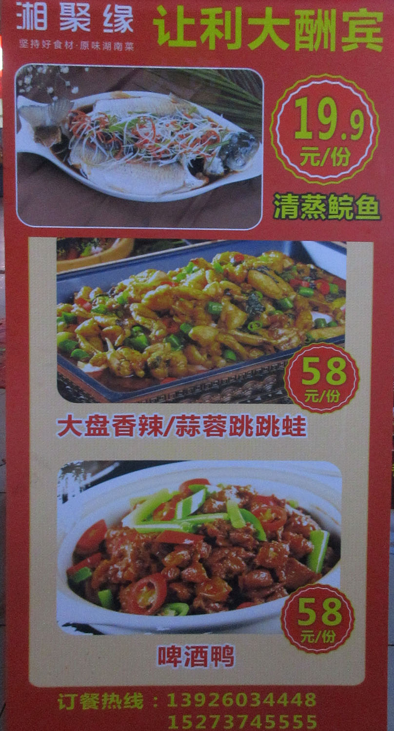 | 南商街四号楼中 湘聚缘 让利大酬宾 清蒸皖鱼19.9元1份 大盘香辣&蒜蓉跳跳蛙58元1份 啤酒鸭58元1份 | ||||||