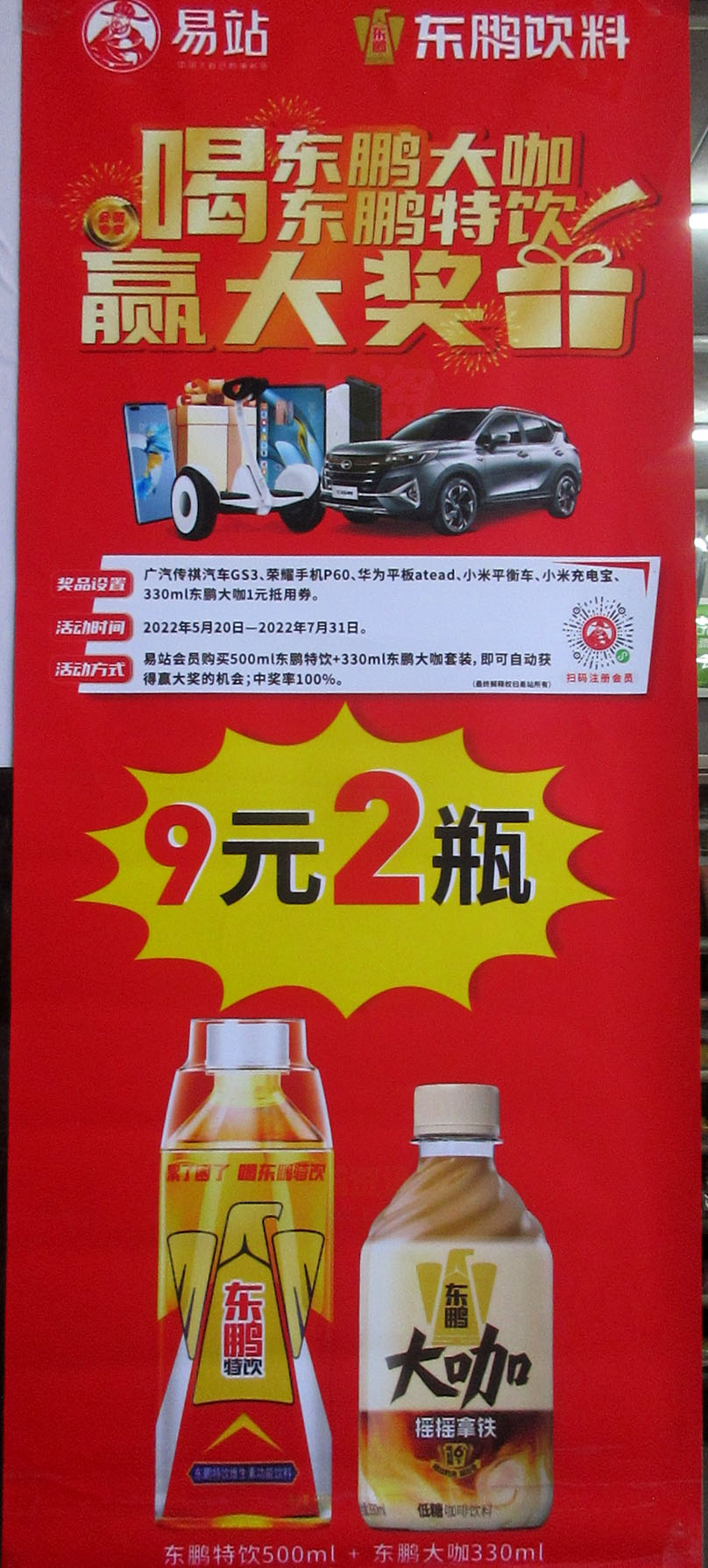 南商街三号楼东 易站便利店 喝东鹏特饮+东鹏大咖赢大奖? 奖品居然还有广汽传祺GS3、荣耀手机P60、华为平板、小米平衡车,以上奖品中奖率有多高?后面的小米充电宝、消费抵用券那倒还听着比较实际 活动时间2022.05.20-07.31