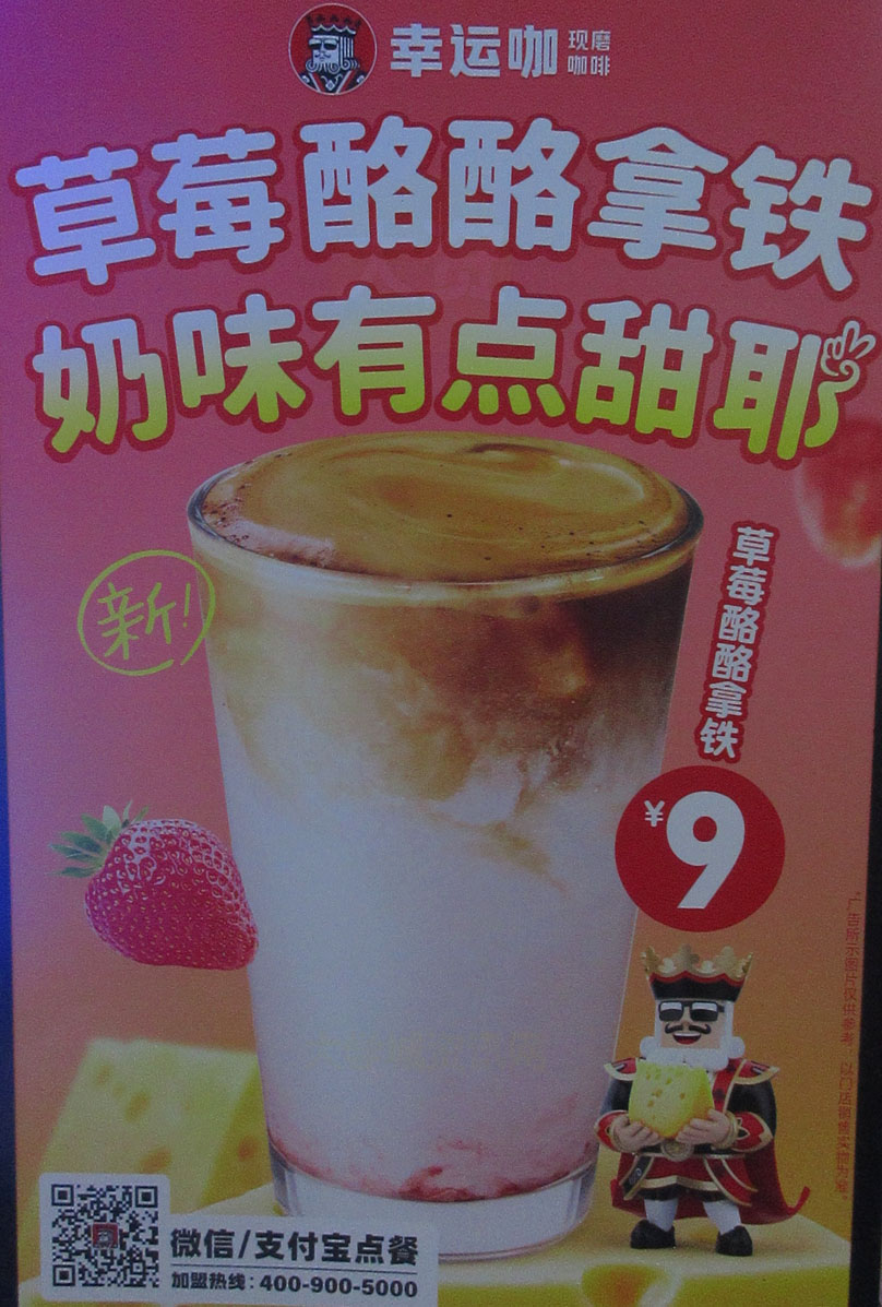 南商街十号楼西列中 原港味壹号茶餐厅已没开,并已新装开一家叫幸运咖的现磨咖啡店,刚开一周多时间,目前试业中 新品-草莓酪酪拿铁9元,加1元得冰淇淋