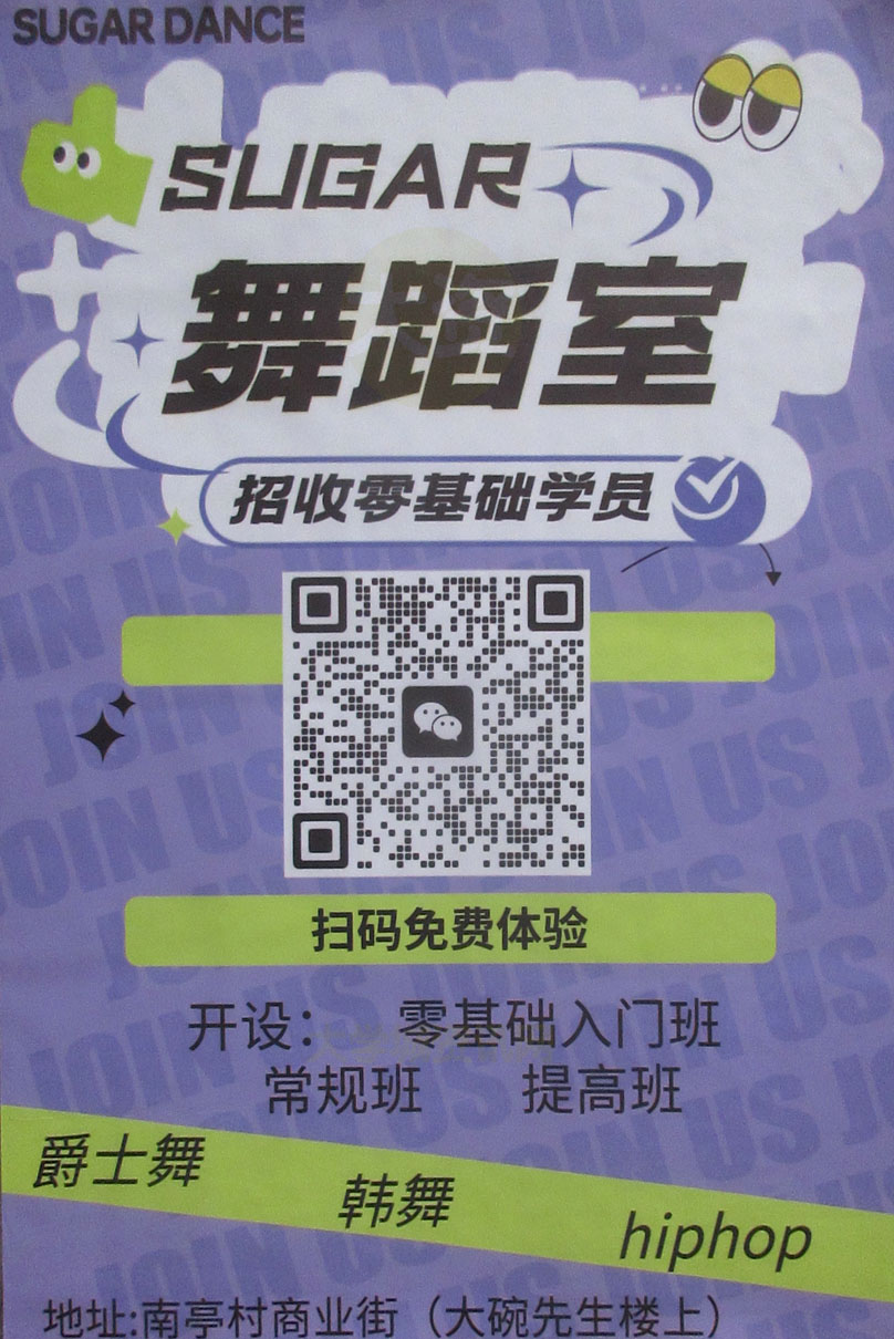 | 南亭商业街-SUGAR舞蹈室招收零基础学员 扫码免费体验 开设:入门班 常规班 提高班 涵盖爵士舞 韩舞 hiphop | ||||||