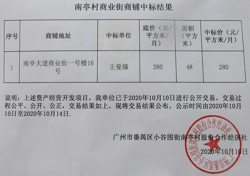 | 南亭村商业街商铺(一号楼16号)中标结果公示[2020.10.10] | ||||||