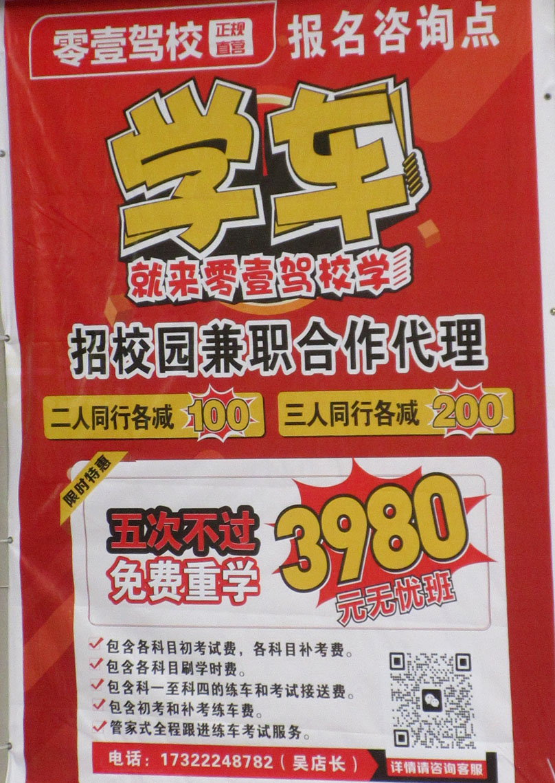 | 南亭商业街八号楼西角楼梯上二楼 零壹驾校 限时特惠 3980元无忧班 两人同行各减100 三人同行各减200 电话17322248782吴店长 | ||||||