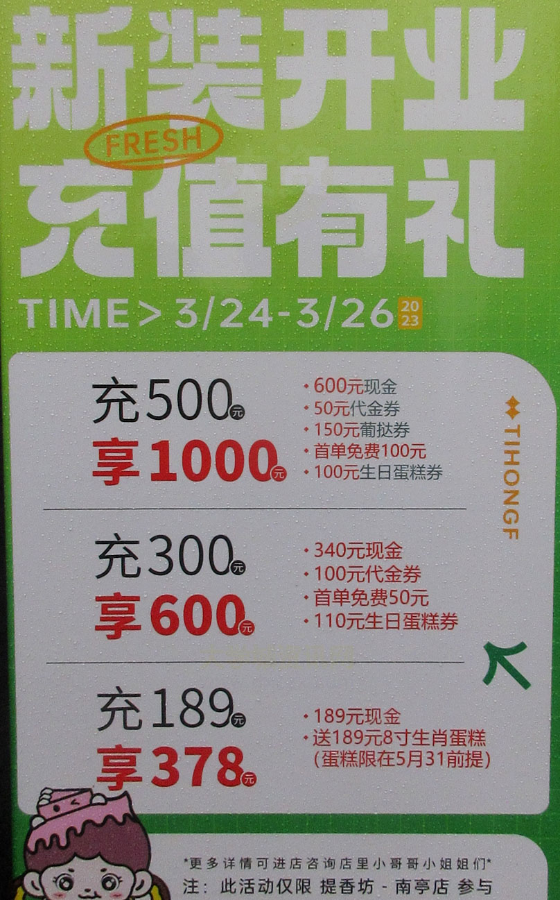 南亭商业街十号楼北列中 提香坊蛋糕店已经新装开业 开业期间3.24-3.26优惠活动福利赠送等还是比较多的
