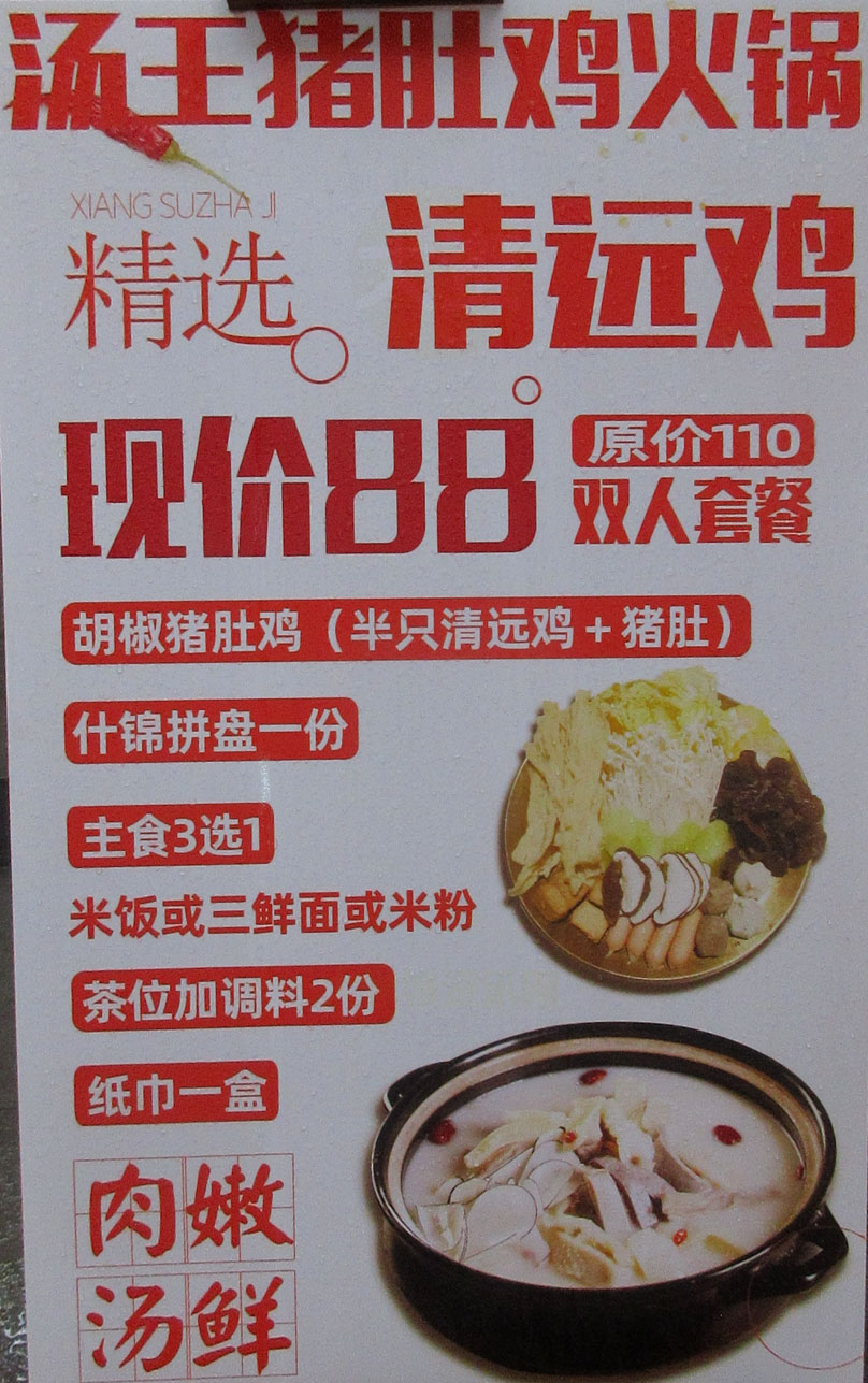 南商街十一列 满堂红·汤王猪肚鸡 精选清远鸡 双人套餐原价110元现价88元-胡椒猪肚鸡(半只清远鸡+猪肚),什锦拼盘一份,主食3选1(米饭或三鲜面或米粉),茶位加调料两份,纸巾一盒;猪肚鸡火锅-半只清远鸡+猪肚68元,一只清远鸡+猪肚128元