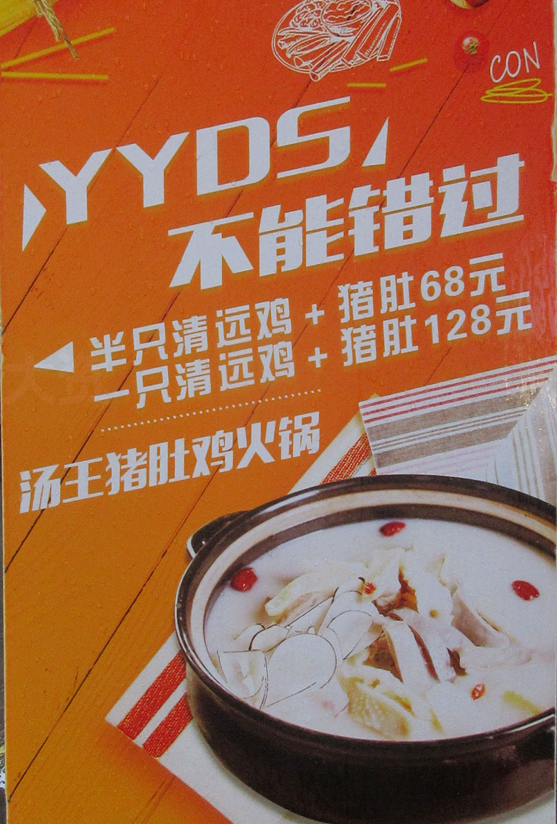 | 南商街十一列 满堂红·汤王猪肚鸡 精选清远鸡 双人套餐原价110元现价88元 猪肚鸡火锅-半只清远鸡+猪肚68元,一只清远鸡+猪肚128元 | ||||||