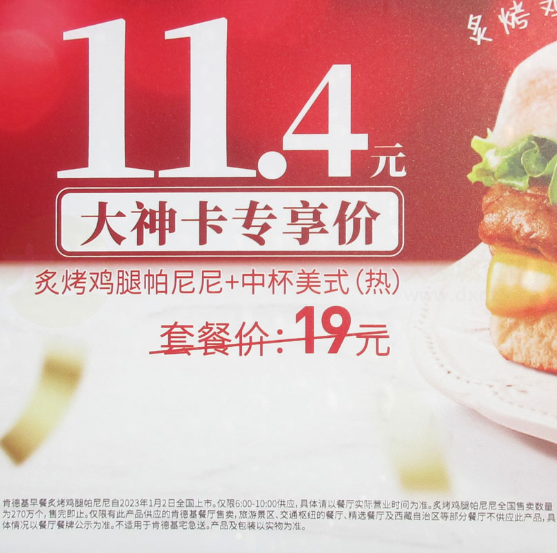 | 肯德基KFC早餐-WOW会员38元90天大神卡,每天任一早餐两件套6折 炙烤鸡腿帕尼尼+中杯美式(热)套餐价19元,大神卡专享11.4元,扫码抢购 | ||||||