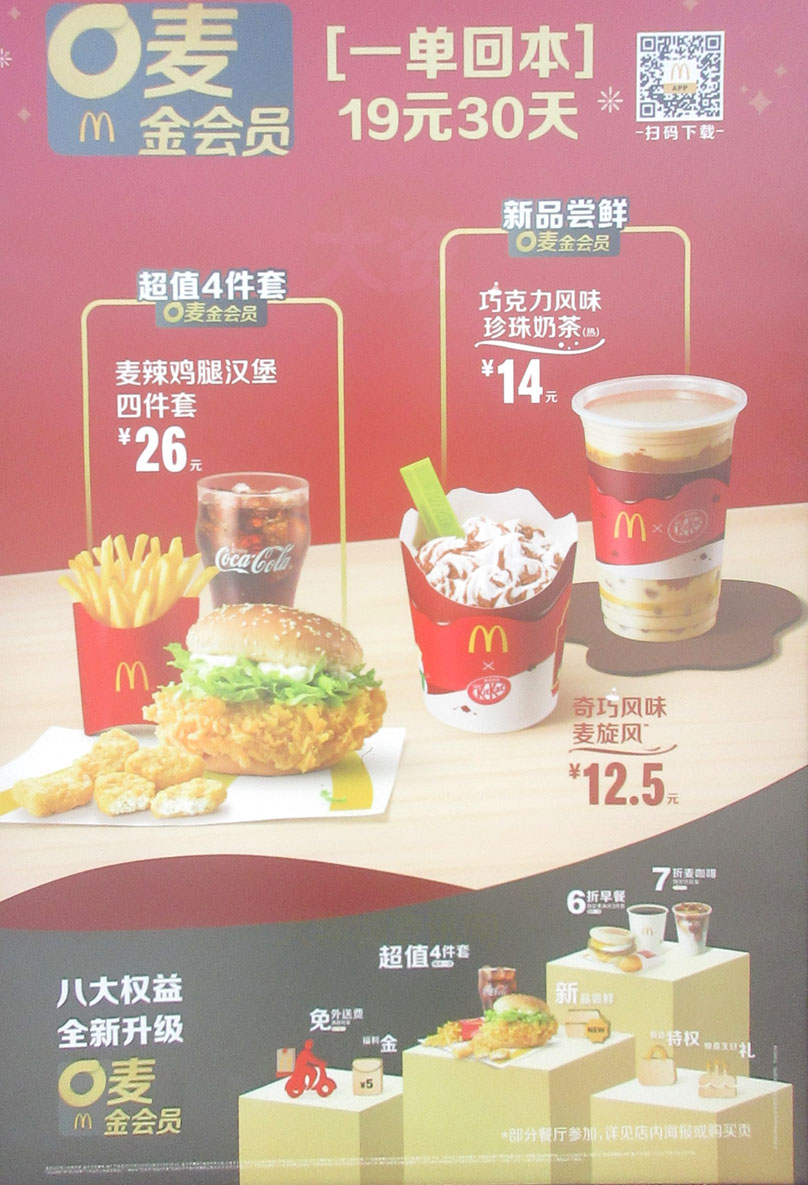 麦当劳O麦金会员19元30天 扫码下载 专享价:麦辣鸡腿汉堡超值四件套26元,新品尝鲜-巧克力风味珍珠奶茶14元,奇巧风味麦旋风12.5元 全新升级,八大权益详内见