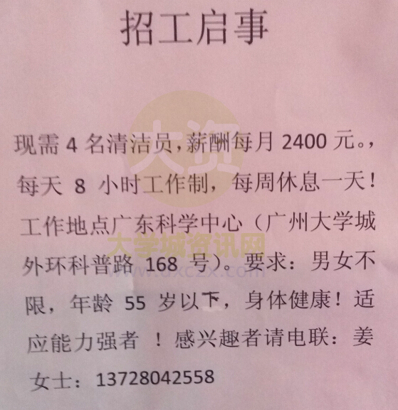 | 【招工启事】现需招4名清洁员 | ||||||