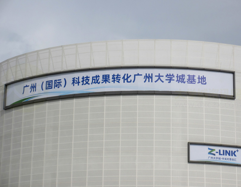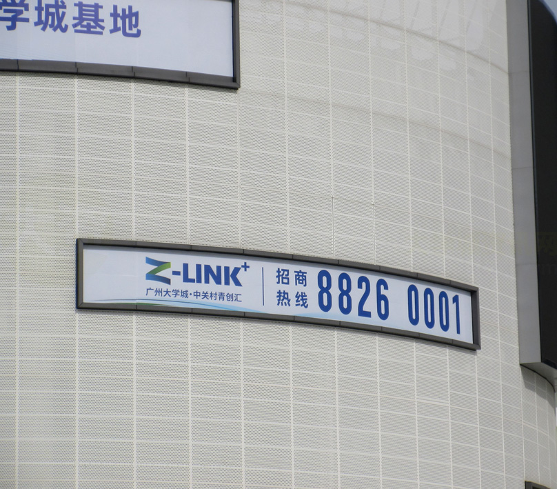 青创汇-麦当劳所在圆柱形楼外立面西侧 新加装了科技成果转化基地标识牌和招商联系提示牌