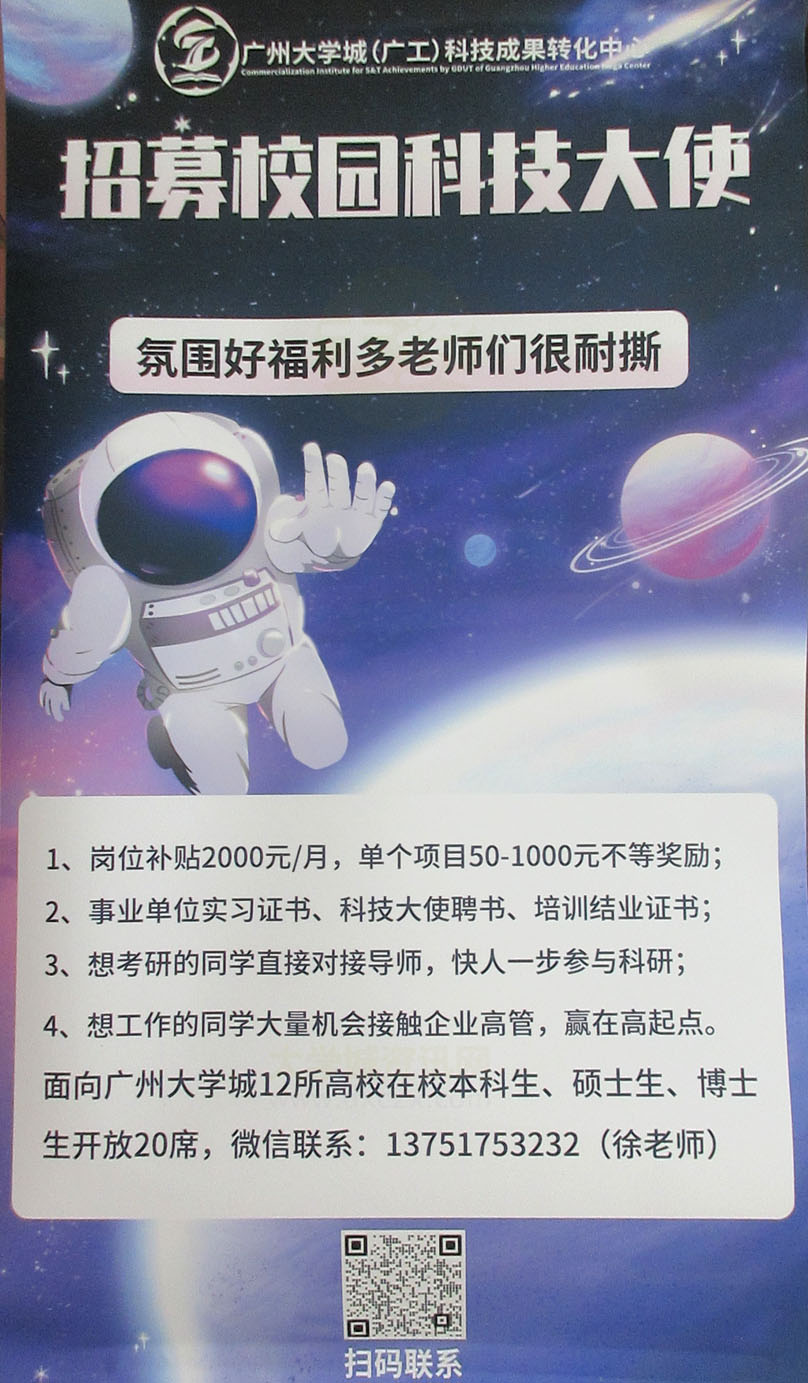 | 广州大学城(广工)科技成果转化中心招募校园科技大使 1.岗位补贴2000元每月,单个项目50-1000奖励;2.有实习证书、科技大使聘书、培训结业证书; 面向大学城所有高校,共招20人,扫码联系 | ||||||