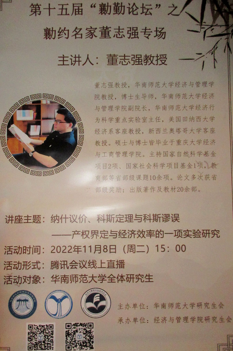 第十五届勷勤论坛之勷约名家董志强专场 讲座主题:纳什议价、科斯定理与科斯谬误 时间2022.11.08周二下午15点 线上直播视听