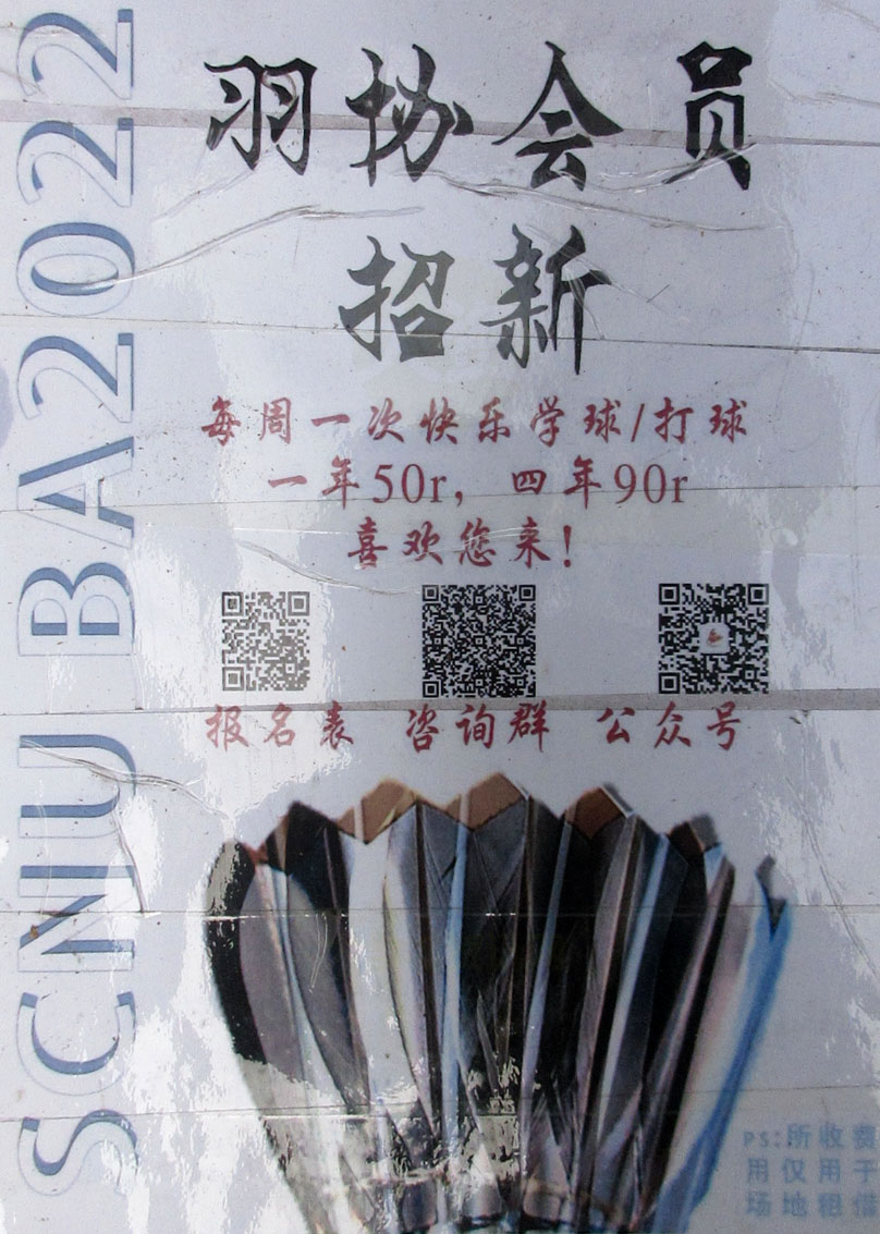 华师羽毛球协会2022招新 每周一次快乐学球&打球 一年50r,四年90r 扫码进入咨询群&获取报名表