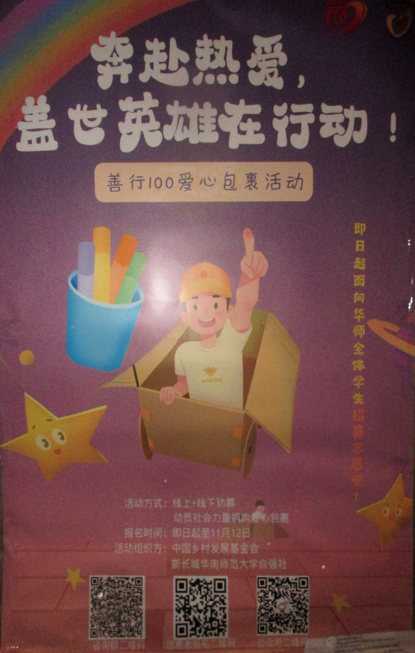 奔赴热爱,盖世英雄在行动!善行100爱心包裹活动 活动方式:线上+线下 报名时间:即日起至11月12日