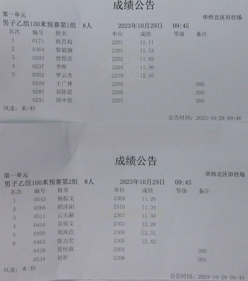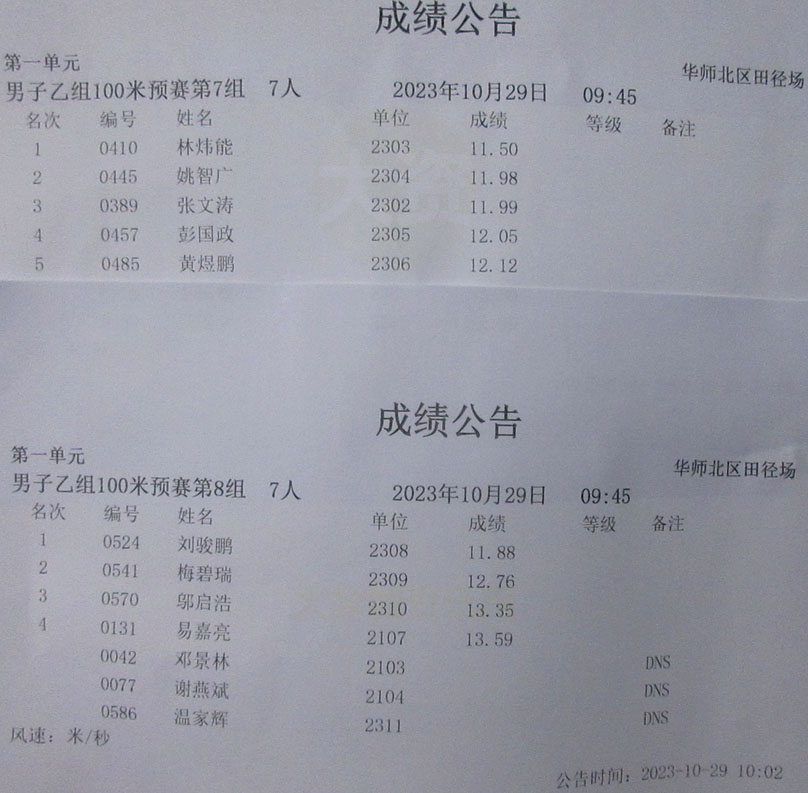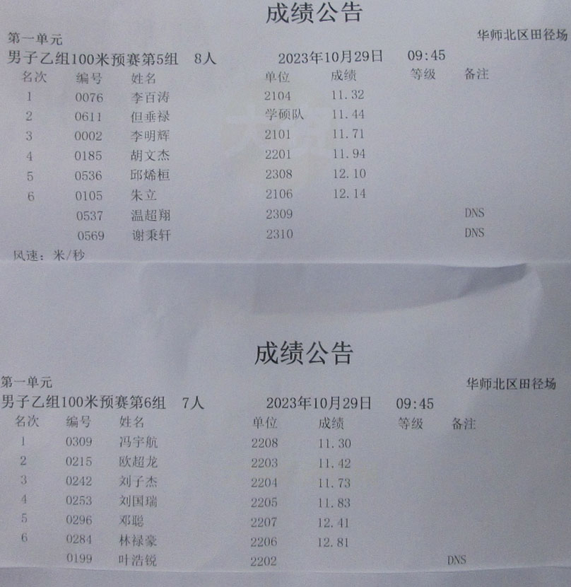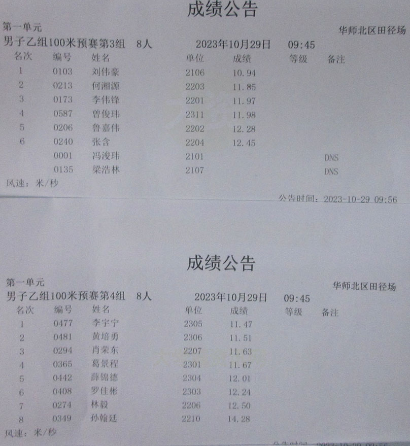 华师体育学院2023田径运动会10.29 男子乙级100米预赛各组成绩
