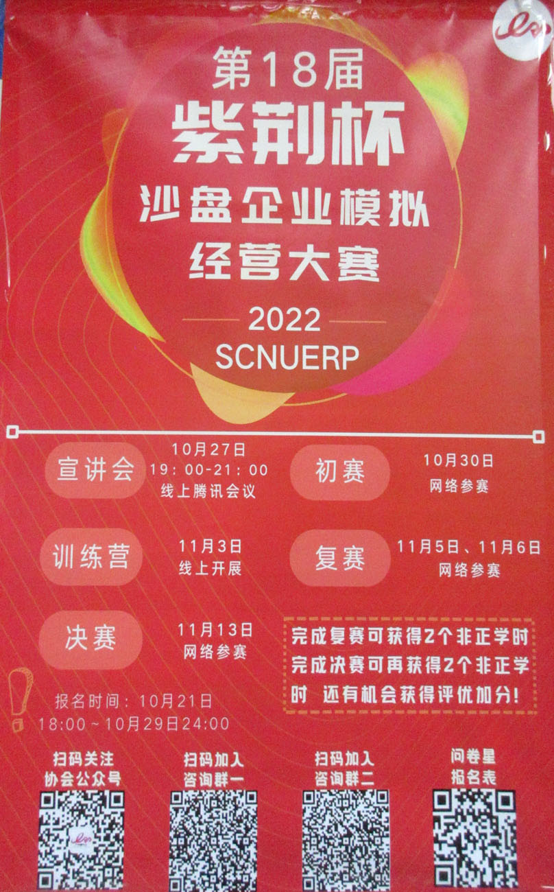 第18届紫荆杯沙盘企业模拟经营大赛 宣讲会-10月27日19点-21点 线上视看 初赛-10月30日网络参赛 训练营-11月3日线上开展 复赛-11月5日、11月6日网络参赛 决赛-11月13日网络参赛 报名时间:10月21日18点-10月29日24点 完成复赛可获得2个非正学时,完成决赛可再获得2个非正学时,还有机会获得评优加分 扫码可关注公众号、进入咨询群、问卷星报名表 |