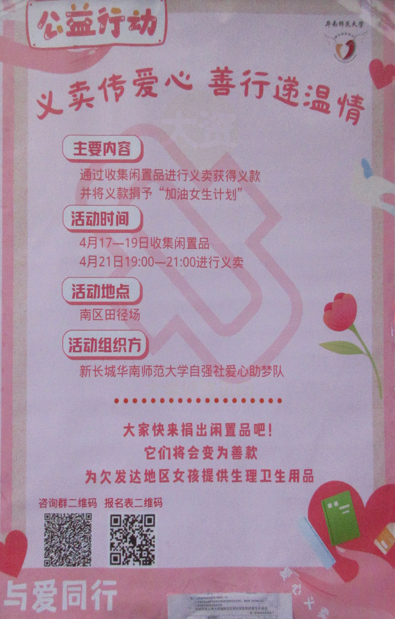 爱心义卖活动 4月17-19日收集闲置品 4月21日周五晚19点-21点进行义卖 华师南区田径场