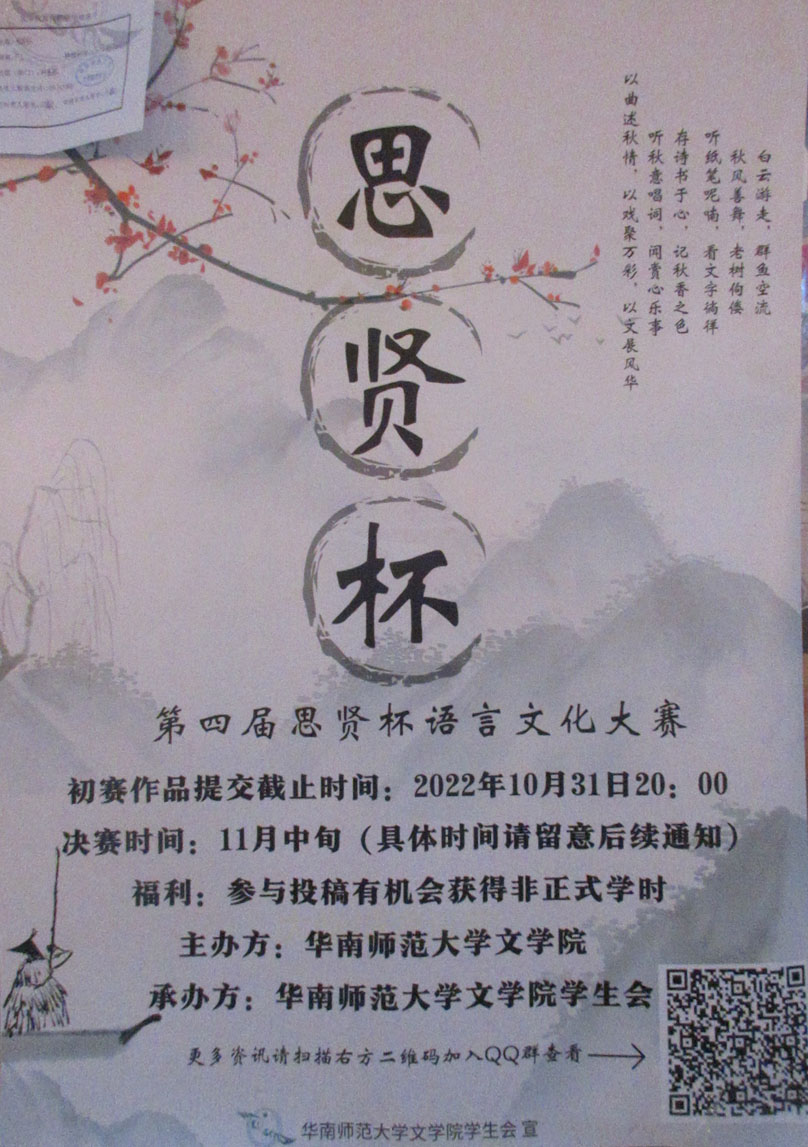 文学院·第四届思贤杯语言文化大赛 初赛作品提交截止于2022.10.31晚20点 决赛-11月中旬 福利:参与投稿有机会获得非正式学时