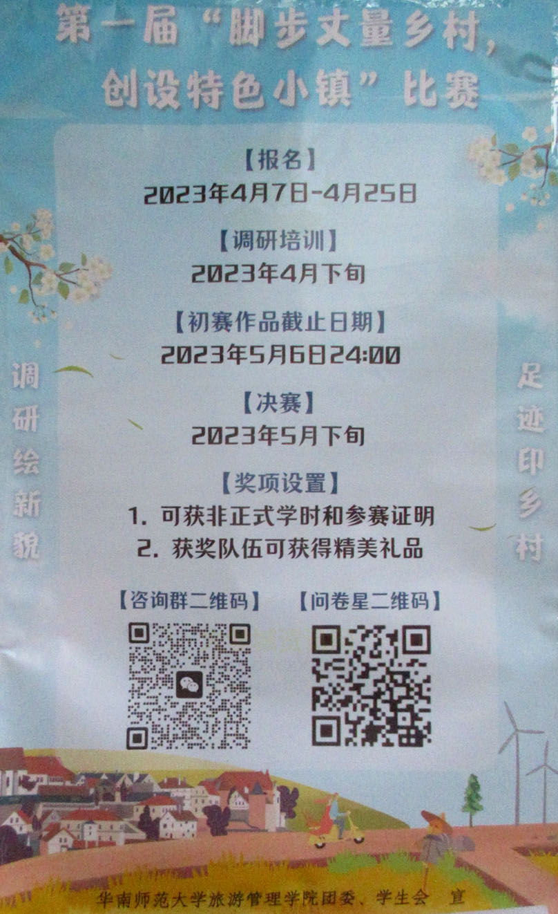 第一届脚步丈量乡村创设特色小镇比赛 报名2023.04.07-04.25 调研培训2023年4月下旬 初赛作品截止2023.05.06 决赛2023年5月下旬 奖项有学时和礼品等