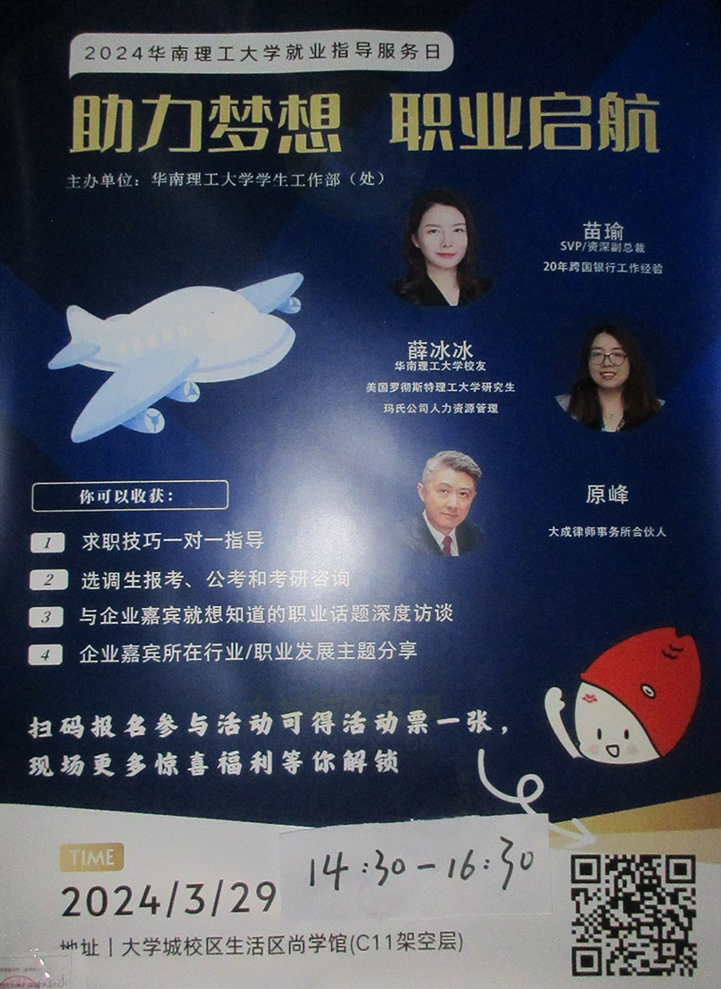 2024华工就业指导服务日·嘉宾分享会 2024.03.29下午14点30-16点30 生活区C11栋负一楼尚学馆 |