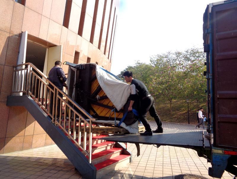 音乐厅正在搬运进一台新的钢琴的样子,目测应该是新的,不是翻修吧
