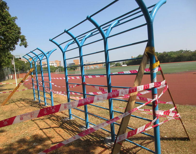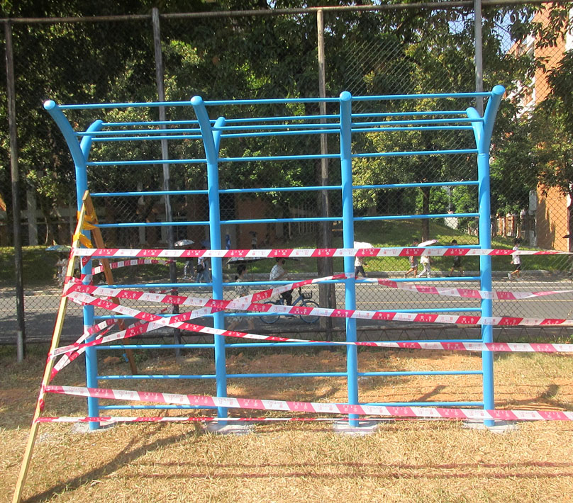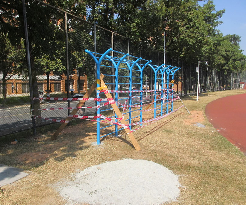 几天前看到的生活区田径场西侧南似准备装立一个新的健身器材,现在看到已筑立好,还在稳固架护阶段,应该暂时还不能供使用