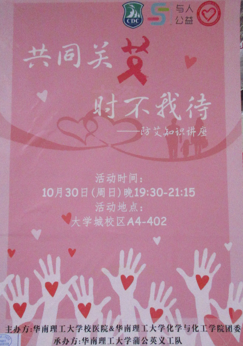 | 与人公益 共同关艾,时不我待--防艾知识讲座 10月30日周日晚19点30-21点15 教学区A4-402 | ||||||
