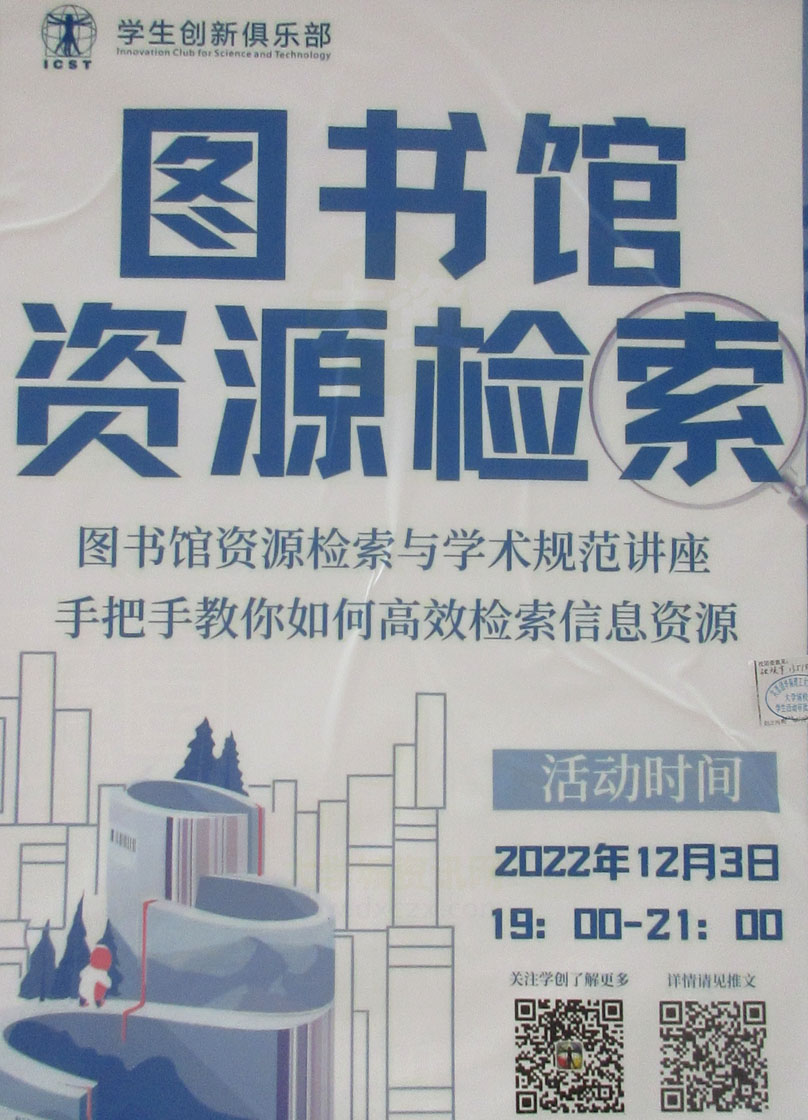 | 学创俱乐部-图书馆资源检索 图书馆资源检索与学术规范讲座 手把手教你如何高效检索信息资源 2022.12.03周六晚19点-21点 详情扫码查看推文 | ||||||
