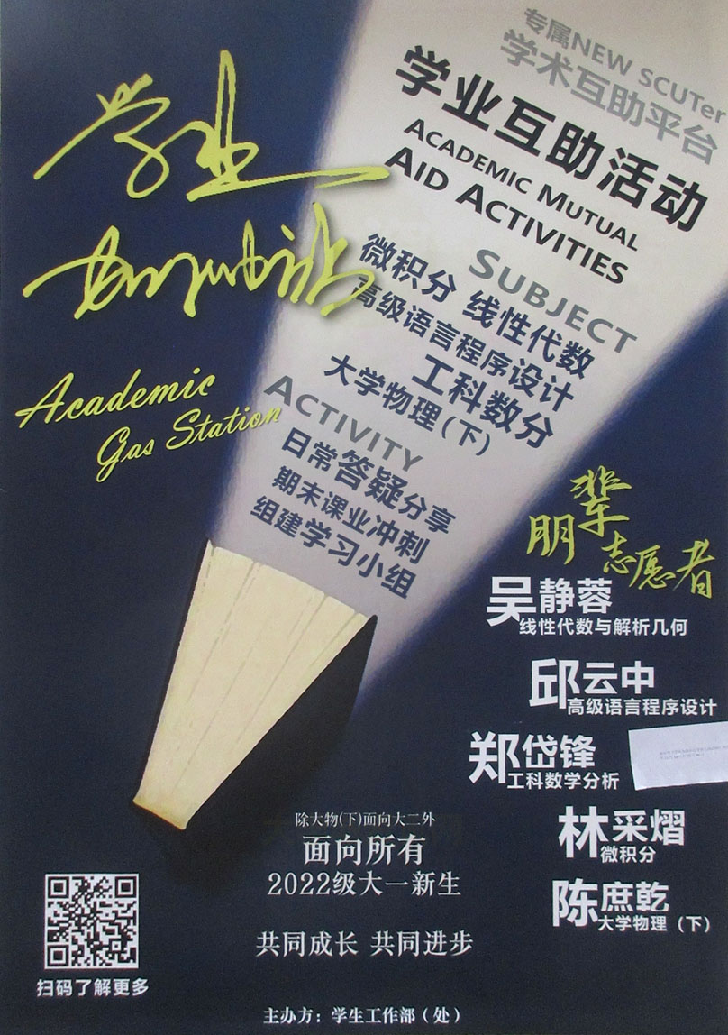 学业加油站·学术互助平台·学业互助活动 近期内容:吴静蓉-线性代数与解析几何,邱云中-高级语言程序设计,郑岱锋-工科数学分析,林采熠-微积分,陈庶乾-大学物理(下) 面向所有2022级大一学生,扫码了解更多