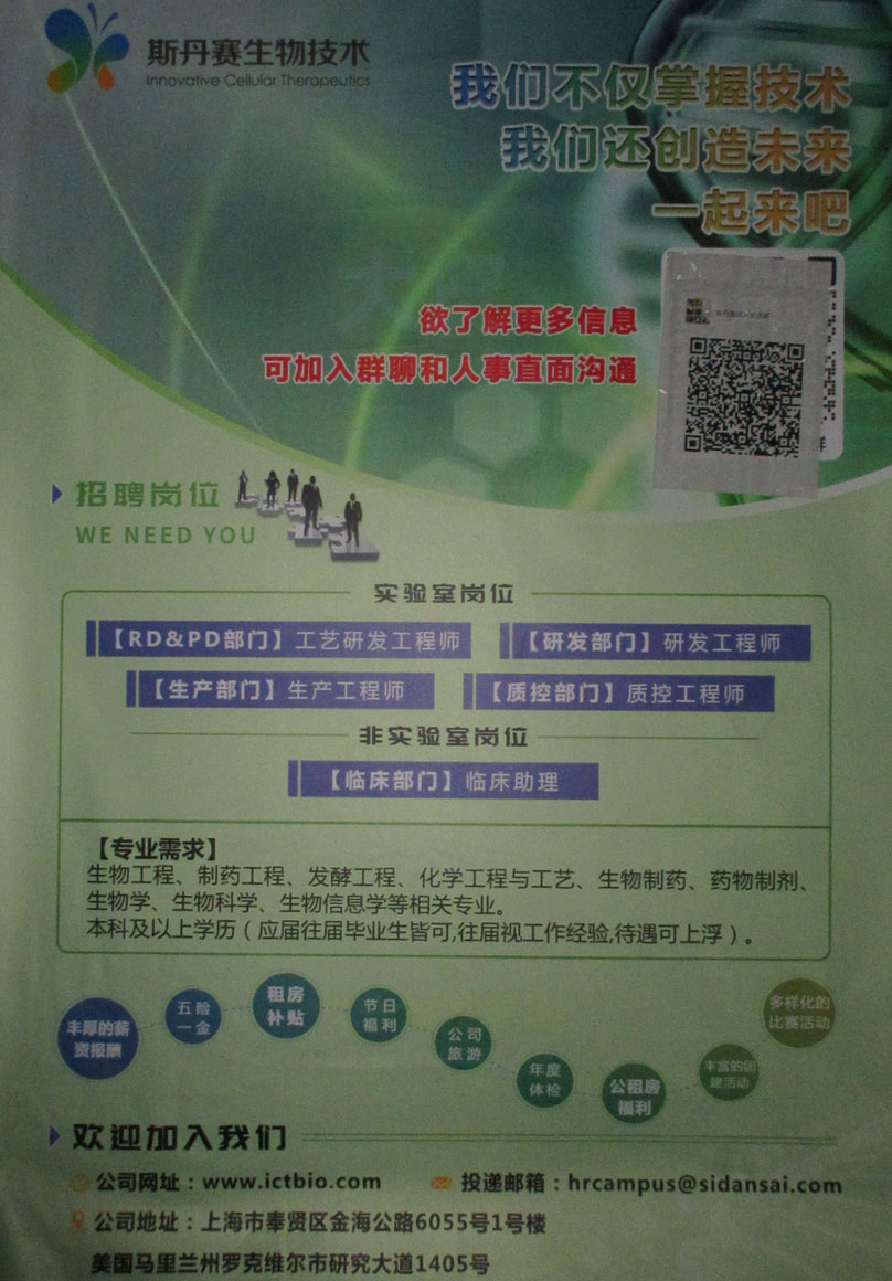 | 斯丹赛生物技术 招聘岗位 实验岗-工艺研发、研发、生产、质控 非实验岗-临床助理 了解更多可扫码加入 | ||||||
