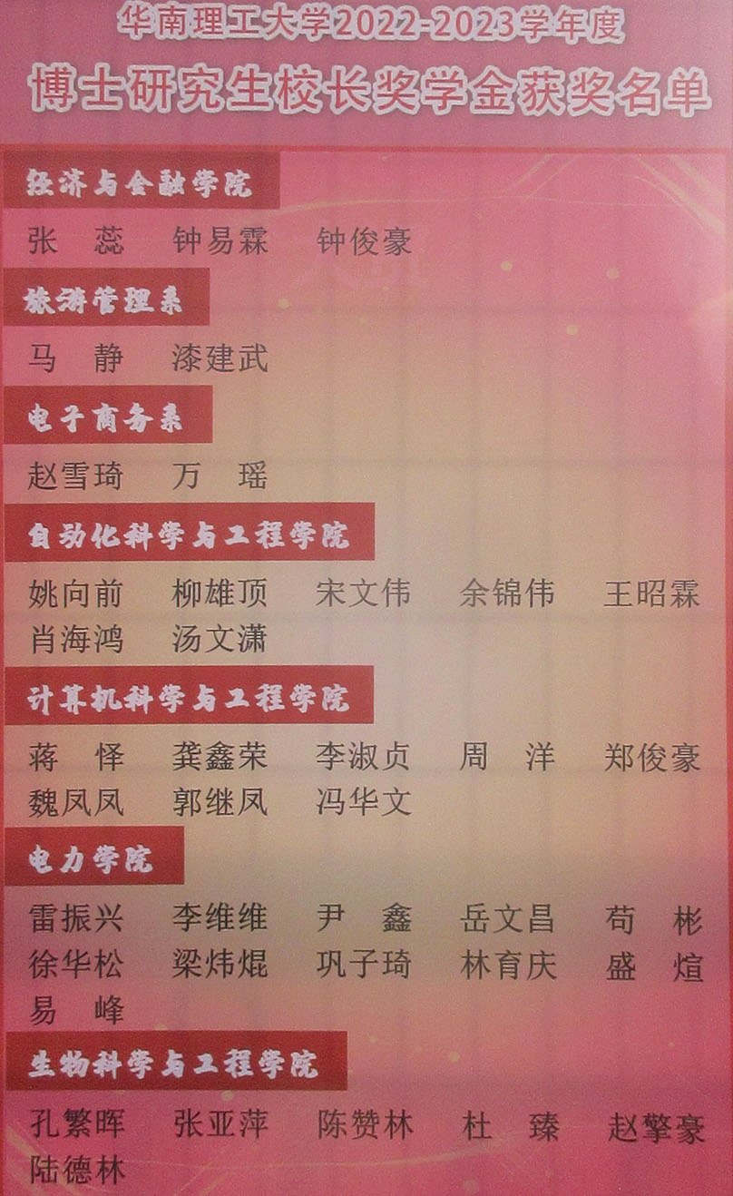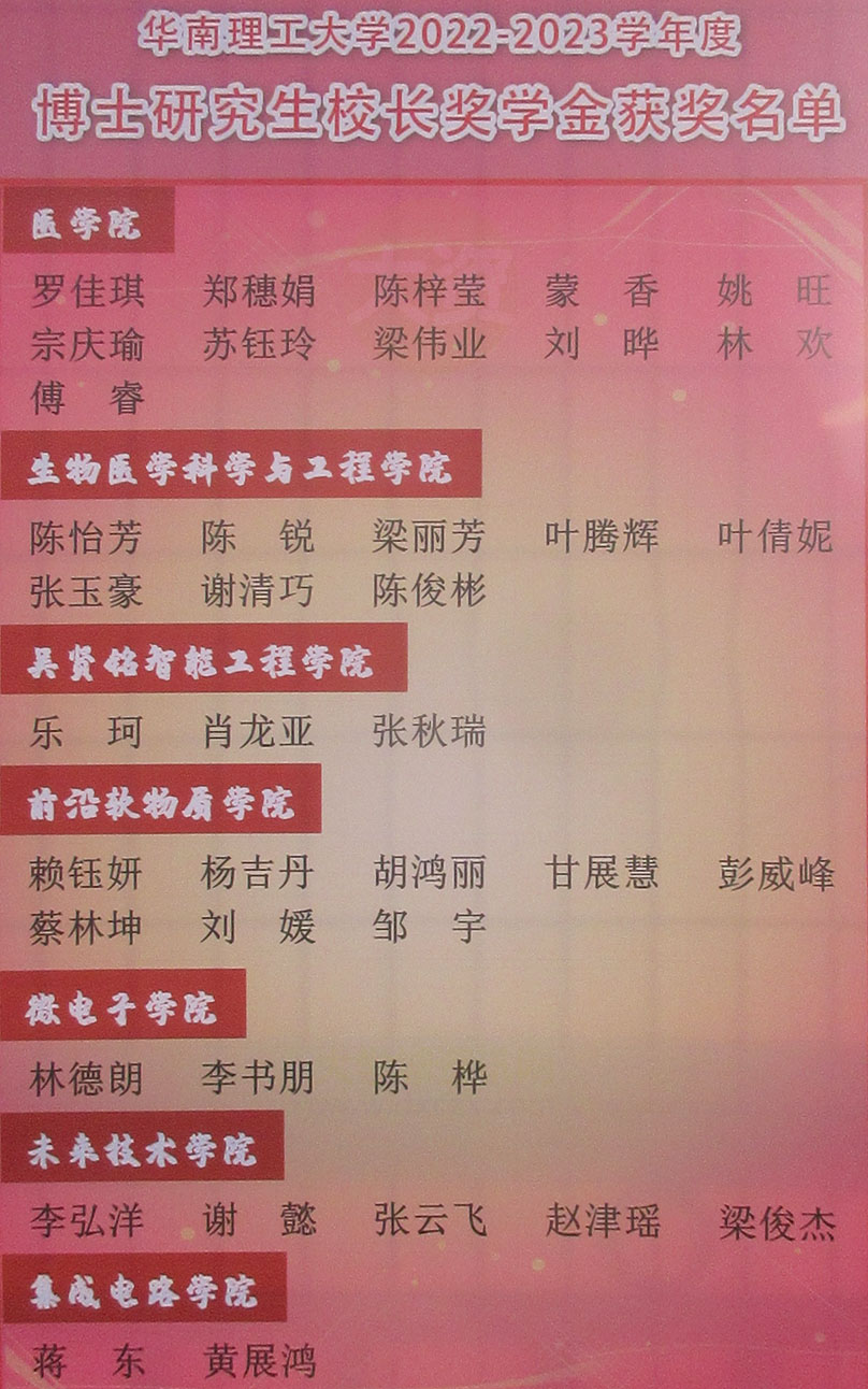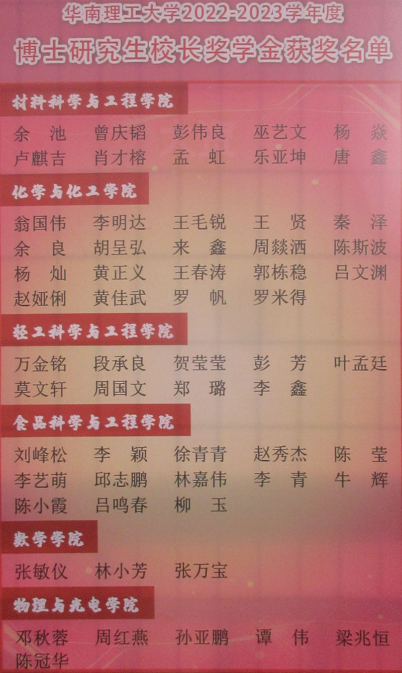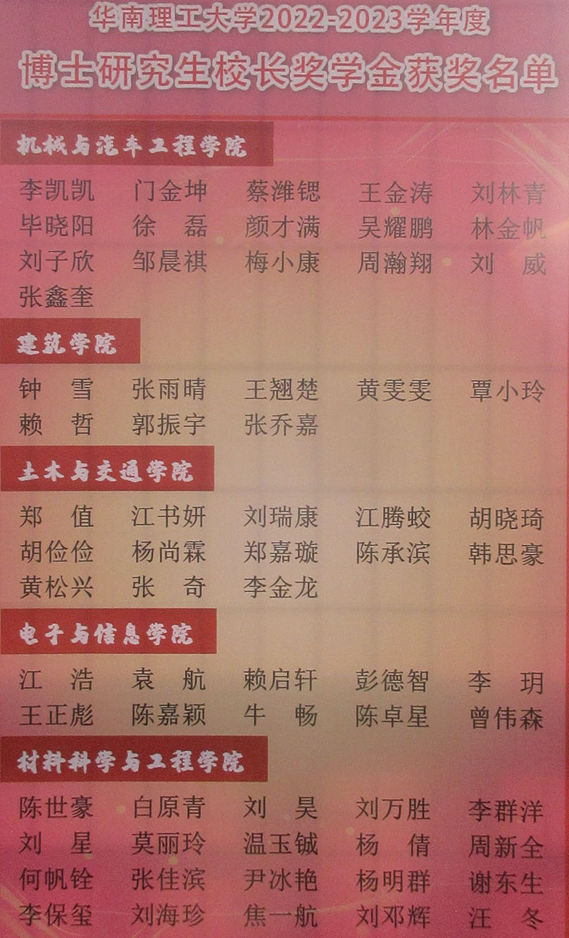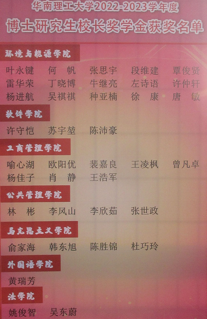 华南理工大学2022-2023学年度 博士研究生校长奖学金获奖者