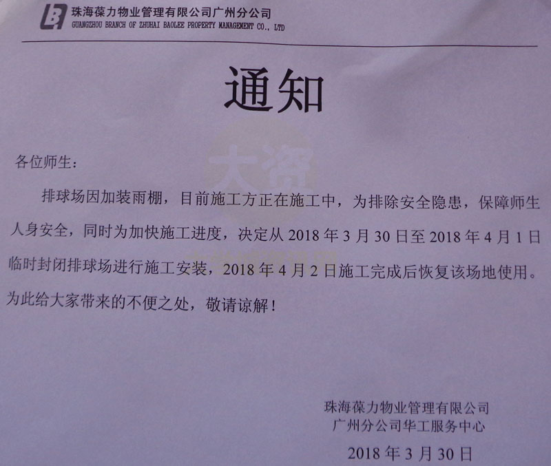 不过通知告示就贴在排球场入口门网外,但还是有学生进入场内进行排球活动,旁边加装雨棚施工也同时正在进行