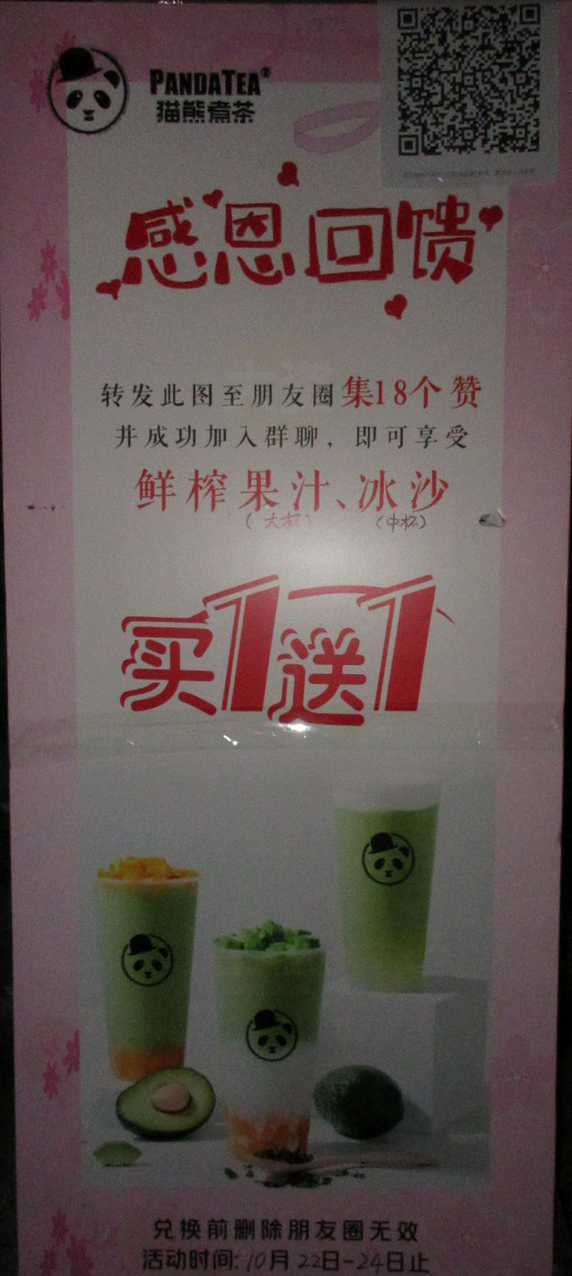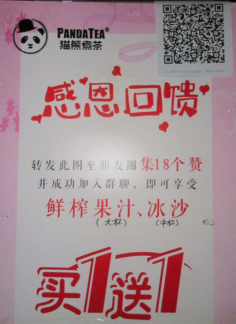 华工生活区-北商业楼-熊猫煮茶 感恩回馈 转发此图至朋友圈集18个赞且加入群聊 即可享鲜榨果汁(大杯)、冰沙(中杯)买1送1
