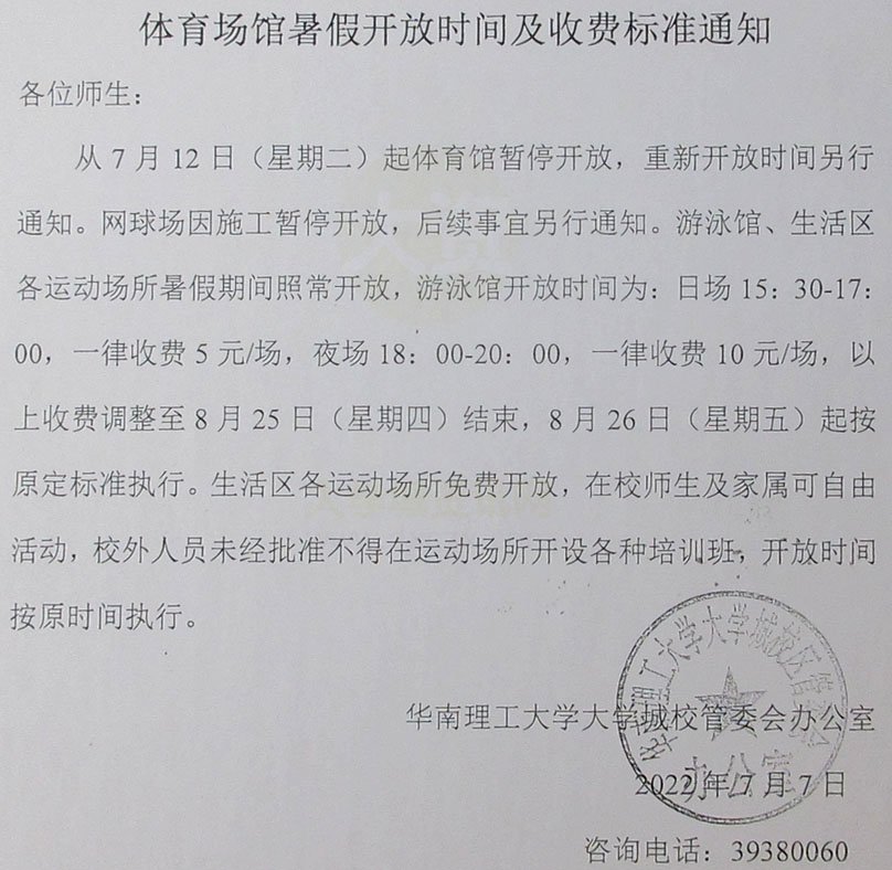 华工体育场馆暑假开放时间及收费标准通知