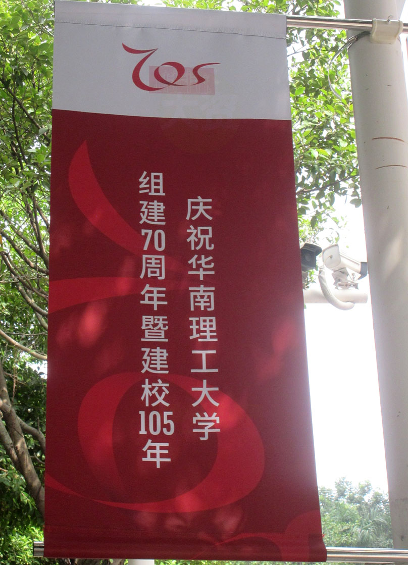 今天是华南理工大学组建70周年建校105周年校庆 华工大学城校区见到也不是很专门有相关活动 就是一些比如饭堂、图书馆、校门口等位置有摆立大幅墙画提示语,还有一些路灯柱有挂一些小画幅也是类似标语,似乎好像听说是不是全校每人都发了一件纪念70周年T恤衫;也许五山校区会可能比较有相关活动或氛围场面吧,毕竟五山校区才是华工的本源和根基/主力