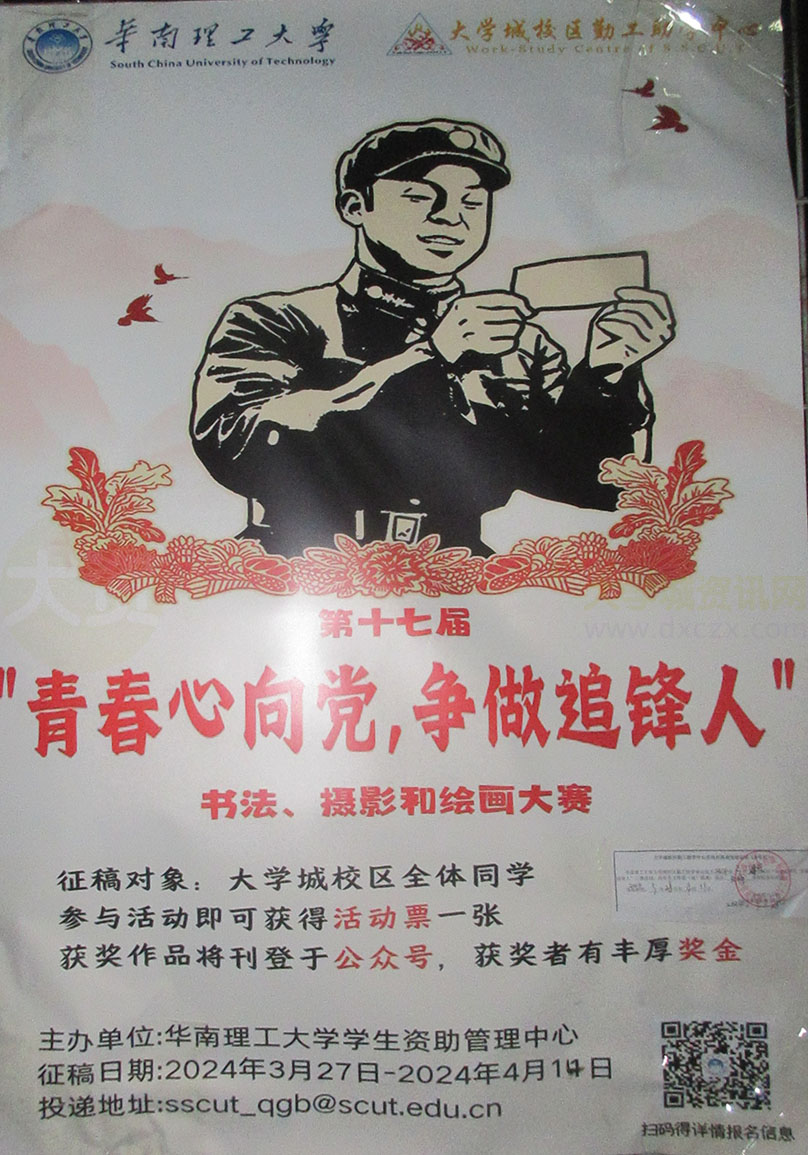 华工-第十七届-春心向党,争做追锋人-书法,摄影和绘画大赛 征稿日期:2024.03.27-04.14 扫码了解报名详情