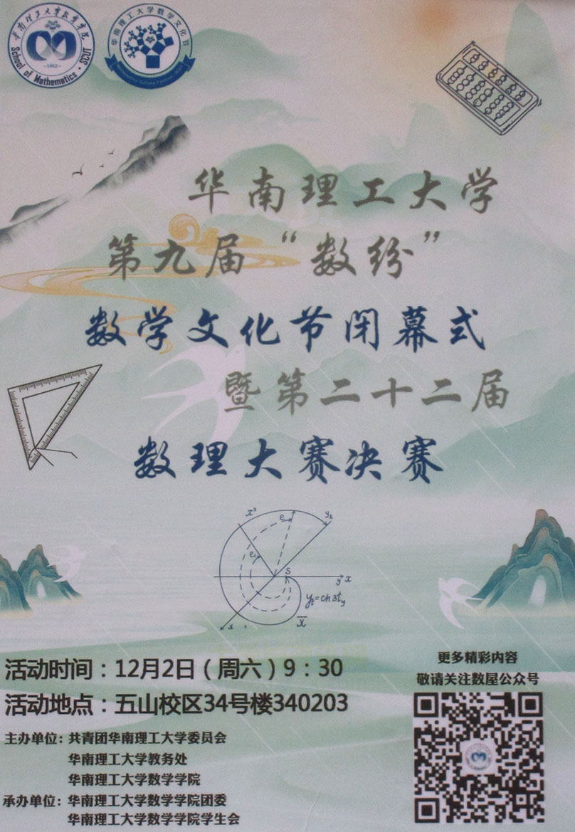 | 华南理工大学第九届数纷数学文化节闭幕式暨第二十二届数理大赛决赛 12.02周六 五山校区34号楼340 203 | ||||||