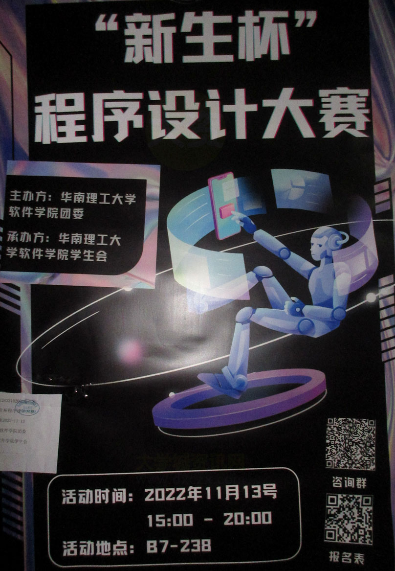 | 新生杯程序设计大赛 时间2022.11.13下午15点-晚上20点 教学区B7-238 扫码进入咨询群&获取报名表 | ||||||