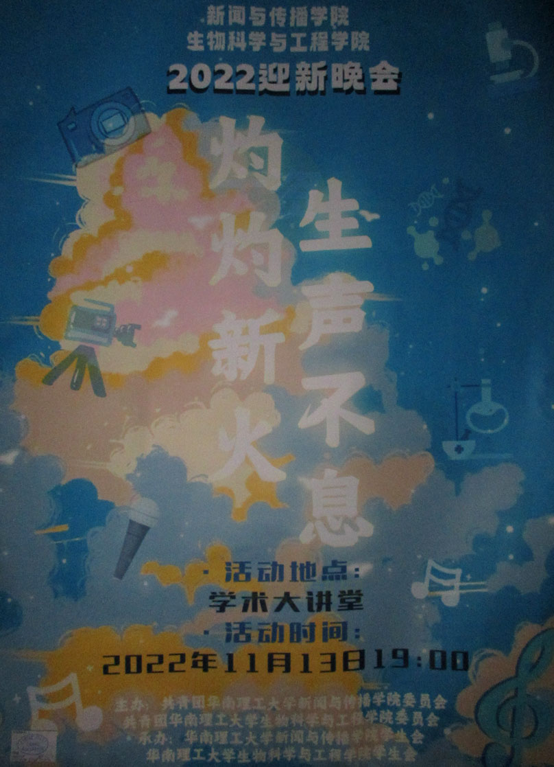 | 新闻与传播学院&生物科学与工程学院 联合2022迎新晚会 2022.11.13周日晚19点 教学区学术大讲堂 | ||||||