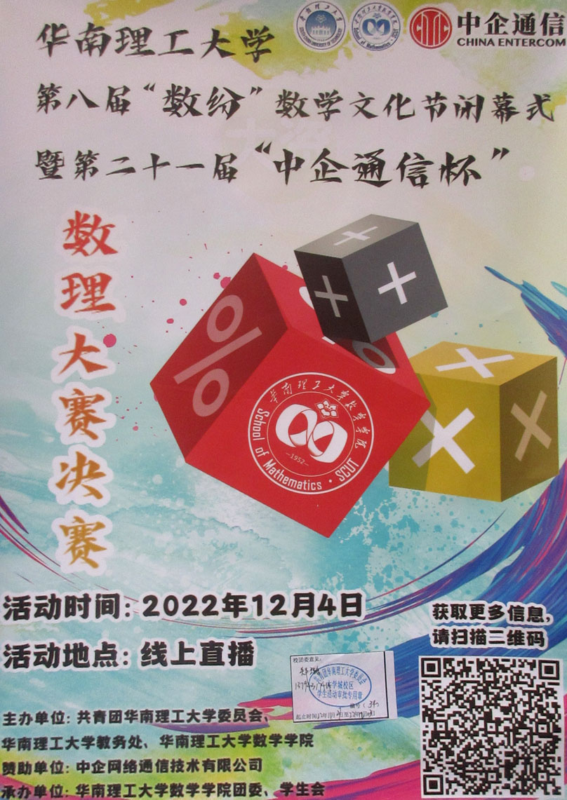 | 华工第八届数纷数学文化节闭幕式暨第二十一届中企通信杯数理大赛决赛 2022.12.04周日 线上直播进行 扫码了解更多 | ||||||